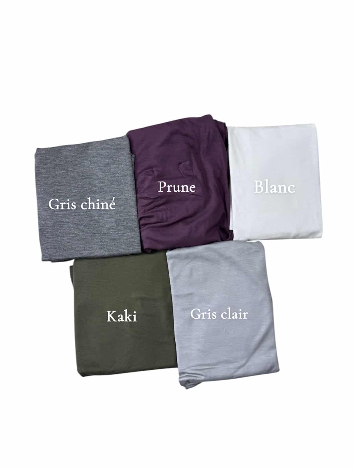 Beige, Blanc, Blanc cassé, Gris chiné, Gris clair, Kaki, Noir, Prune, Taupe