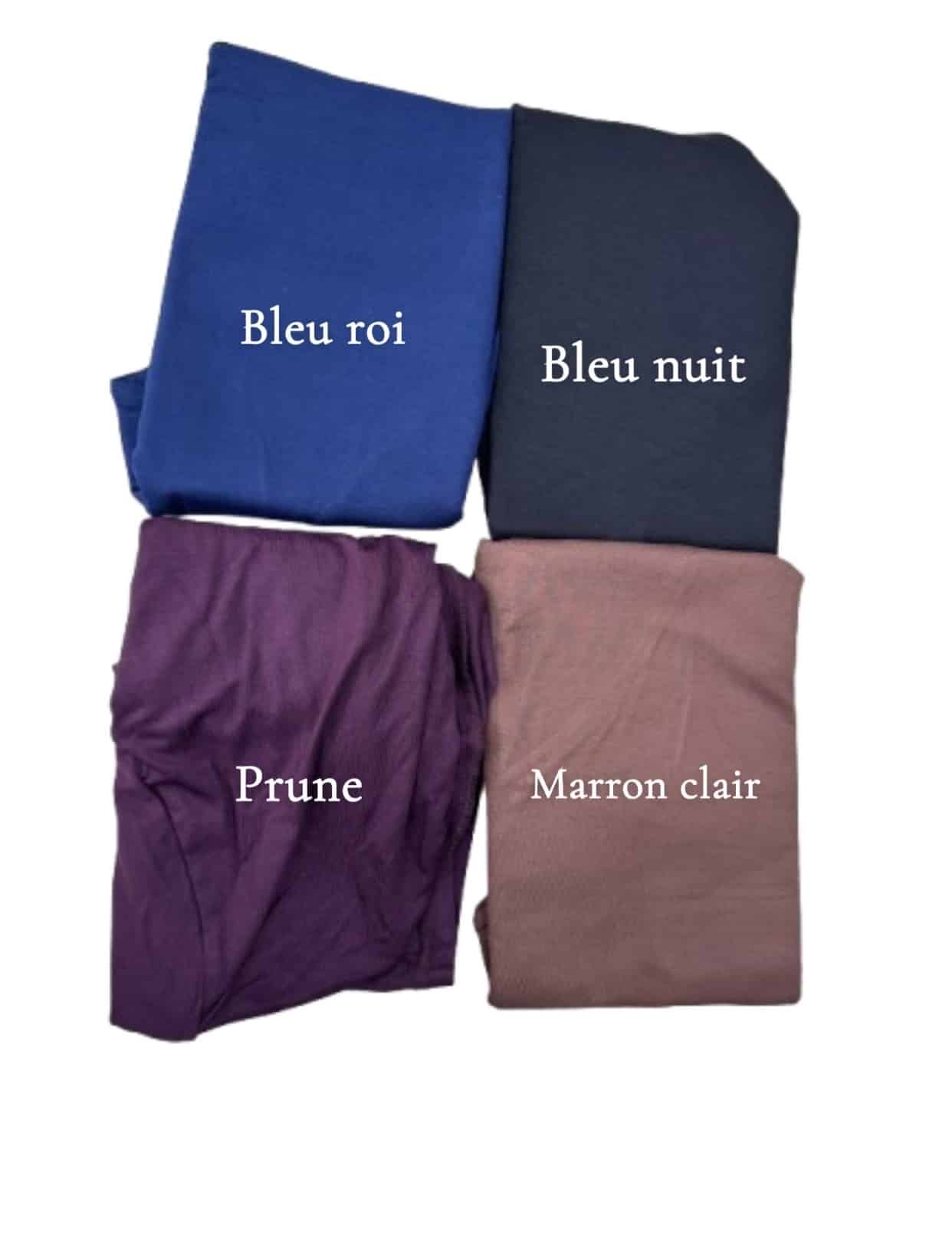 Beige, Blanc, Blanc cassé, Bleu nuit, Bleu roi, Kaki, Noir, Prune, marron clair